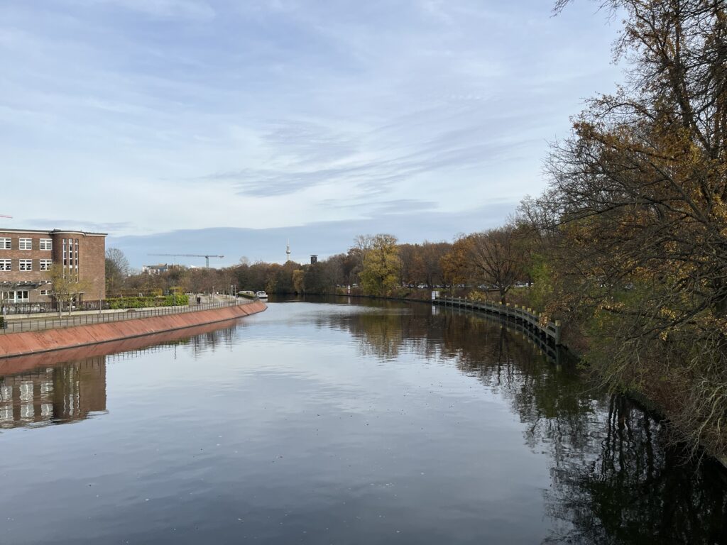 皇帝の隣を流れる川も静かで、開放的な雰囲気です。遠くに、ベルリンのシンボルであるテレビ塔が見えます。