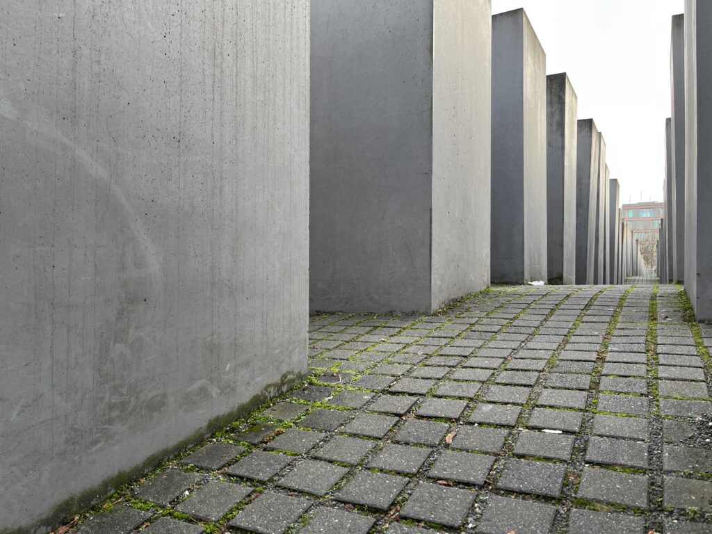 高さも間隔も異なる黒いコンクリートブロックが一帯に立ち並んでいて、誰でも自由にブロックの間を歩くことができます。入り込んですぐは腰までくらいの高さしかないブロックは、歩みを進めるといつの間にか身長を超えてしまい、見上げる空を覆う高さになります。