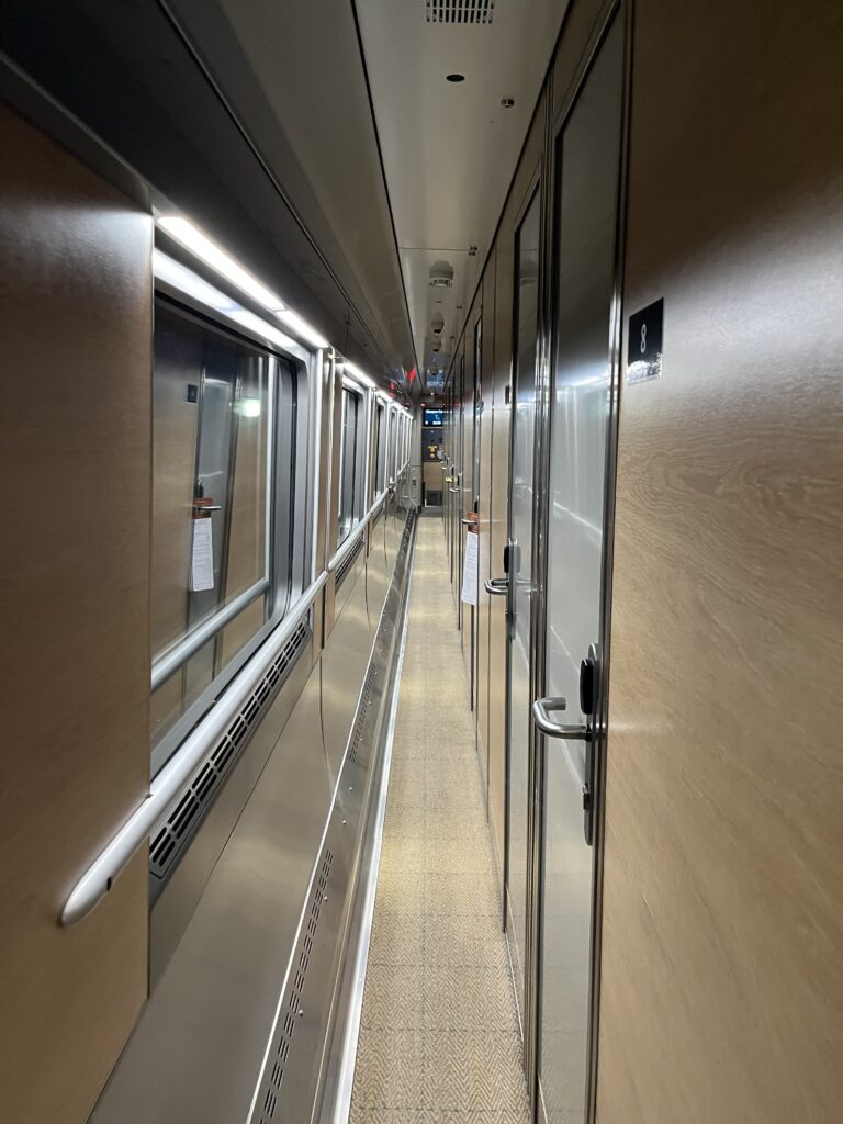 ラウンジでのんびり過ごしていたら乗車のアナウンスがあったため、いよいよ乗車。いざ乗り込んでみるとこんな感じでした。車両によっては個々の客室スペースを広くするために廊下がギリギリの幅まで狭めれており、基本的に一方通行しかできません。また食堂車もあり、ここでは食事間以外でもカフェが楽しめるようになっています。こちらでは翌日、朝食をいただきました。