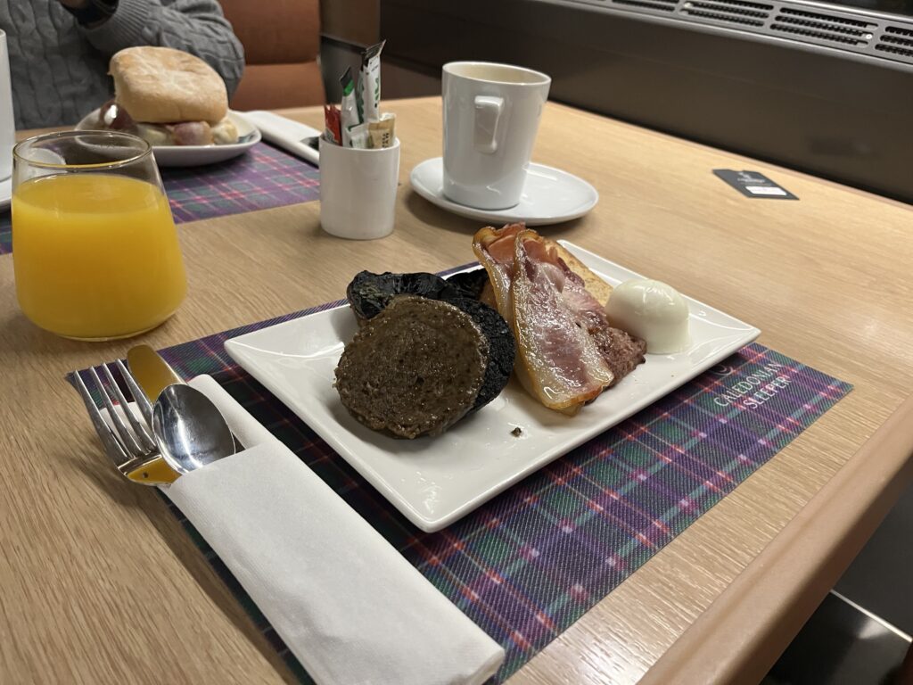 目的地へ到着予定時刻の1時間前には、朝食をいただくために食堂車へ移動しました。すでに数名早起きの乗客がいましたが、さすが英国の冬ということで窓の外は真っ暗でした。
