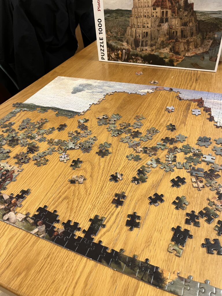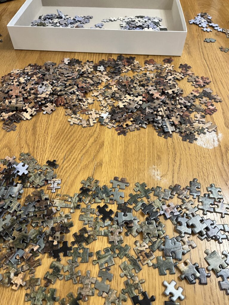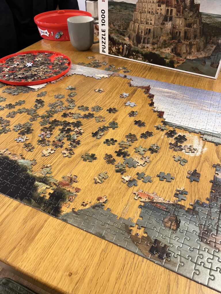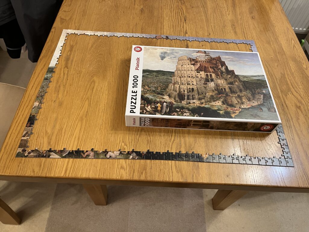 最初の2時間。まずは1000ピースのパズルをバベルの塔、空、海、街のピースに仕分け、ピースの形を頼りに外枠をひたすら作りました。うん、これはまだ楽しい。