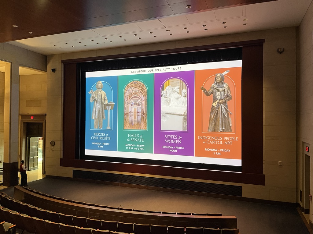 ツアーに参加すると、まずは巨大なシアターに案内され、連邦議会堂の成り立ちやその理念について短いビデオを鑑賞することになる。その後に実際に議事堂の中に入る流れになる。